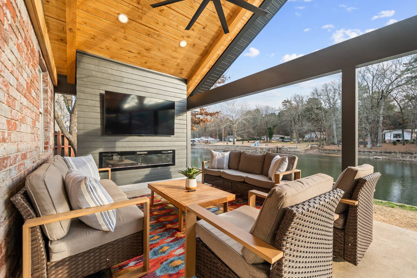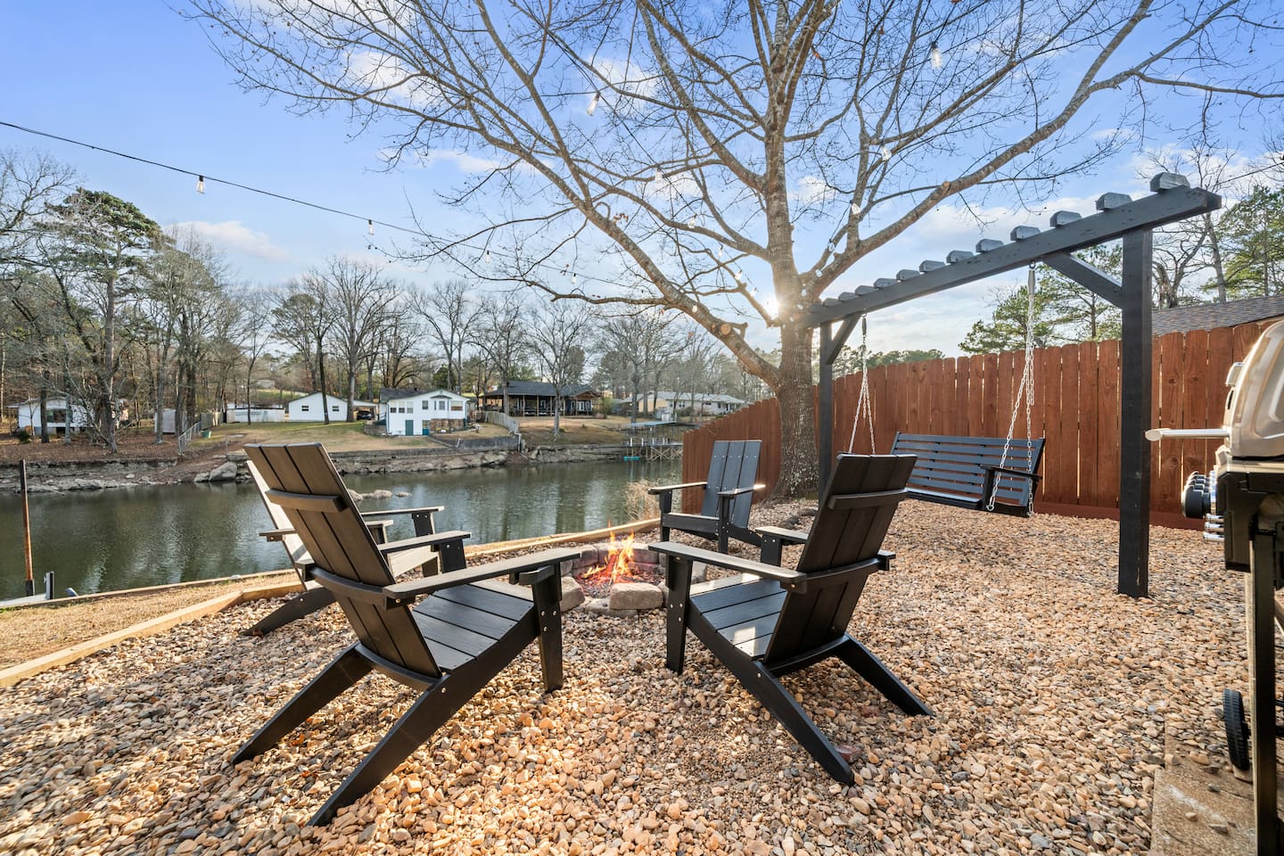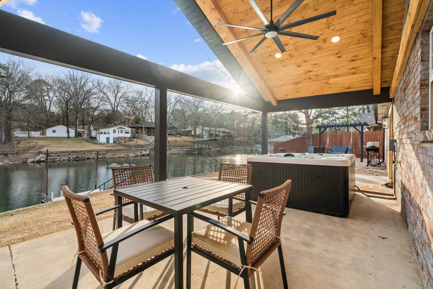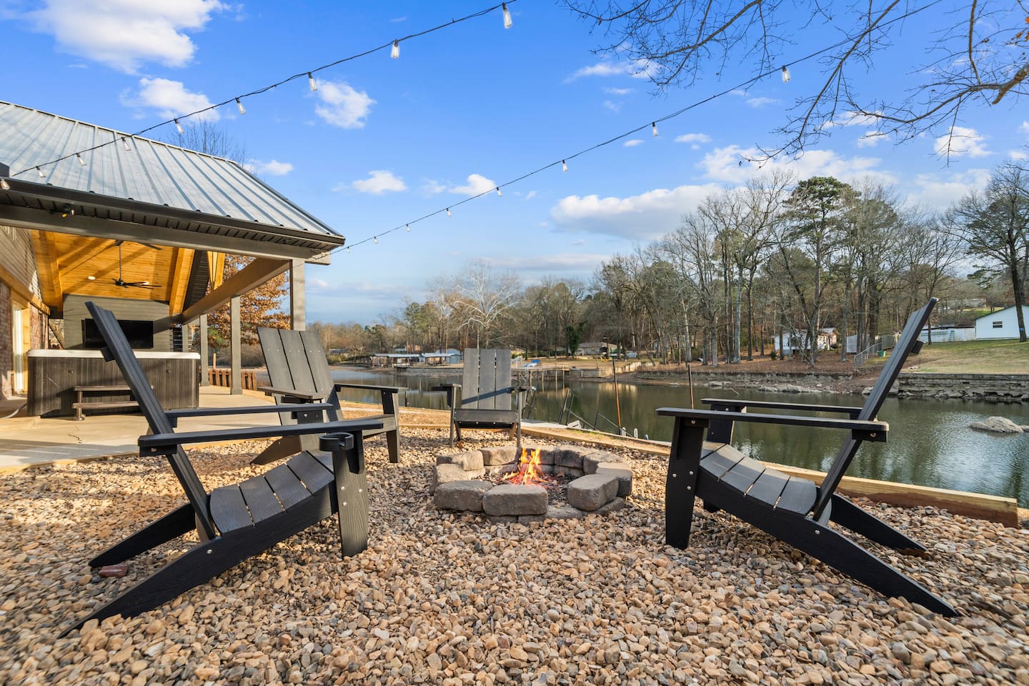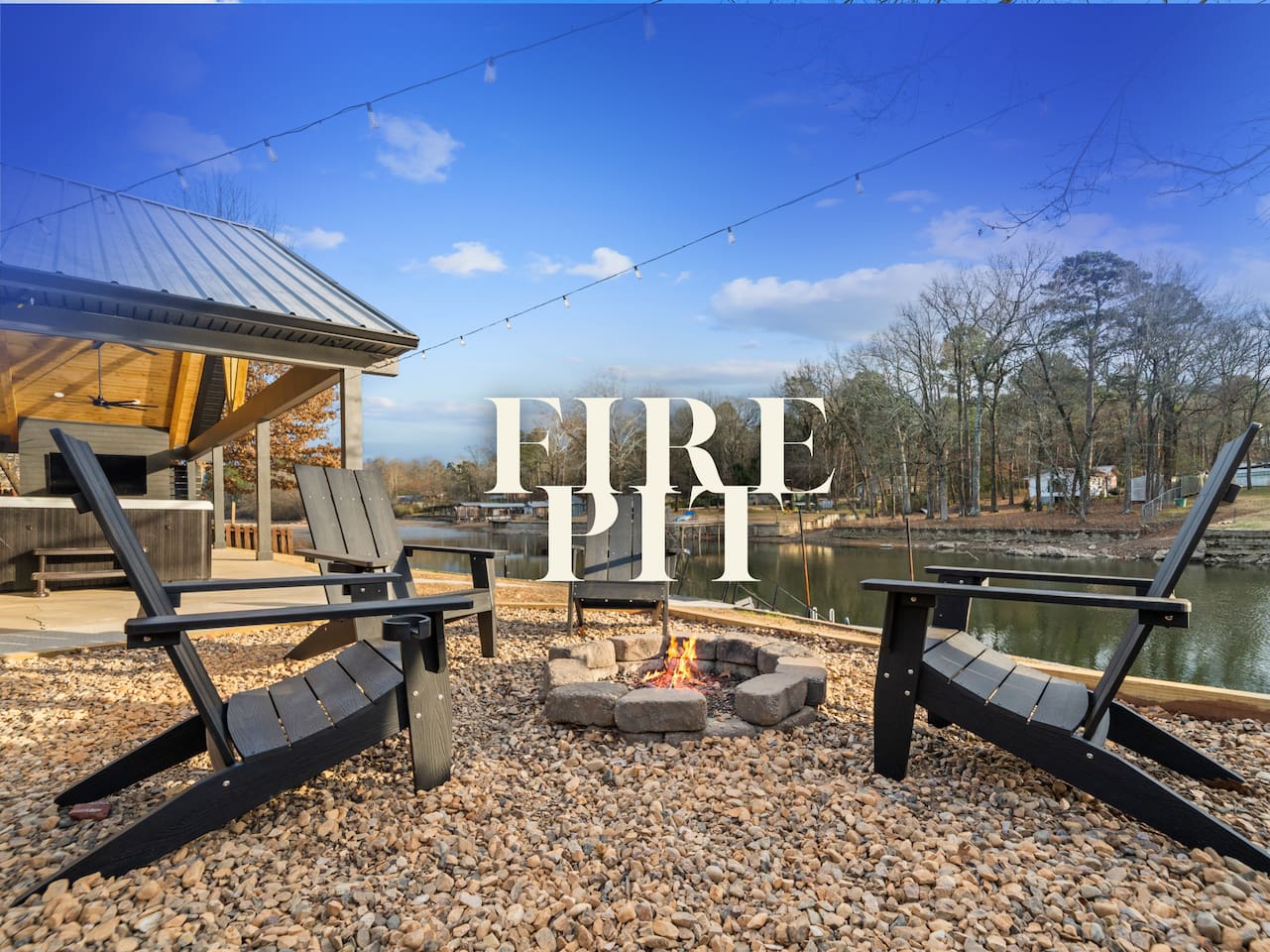 The home comfortably sleeps up to 10 guests and is built for group stays. The main level features three king bedrooms, while the upstairs enclosed loft offers two queen beds. Every bedroom includes a large smart TV, and the primary suite features a dedicated workspace. The private game room anchors the indoor experience with karaoke, pool and shuffleboard tables, and arcade games—perfect for all ages and weather-proof fun. The fully equipped kitchen and open living areas make gathering effortless. Outdoor Living Step outside to direct lake access with a private dock, water ladder, seating, and space to tie up a small boat. Enjoy four complimentary kayaks, relax in the private hot tub, or gather around the lakeside fire pit. A 45-foot covered patio offers space for outdoor dining, lounging, and evening cocktails, plus a small side yard for extra play space. During summer, water surrounds the property front and back—creating enhanced privacy and constant access that’s uncommon on Lake Hamilton. ☞☞HIGHLIGHTS & AMENITIES ☞☞ ✷ Peninsula lakefront home with private dock (sleeps 10) ✷ Water on both sides during summer months ✷ Prime lakefront location with excellent water access ✷ Game room: karaoke, pool table, arcade games & shuffleboard ✷ Private hot tub & lakeside fire pit ✷ Four kayaks included ✷ Large TVs throughout, including living room, game room & patio ✷ High-speed AT&T Fiber Wi-Fi ✷ Fully equipped kitchen & dedicated coffee bar ✷ Ideal for families and relaxed group getaways Whether you’re here to relax, play, or do a little of both, Cape Hamilton delivers the ultimate Hot Springs lakefront experience. Book now and start counting down to lake days, game nights, and unforgettable memories. 🌊🔥🎤