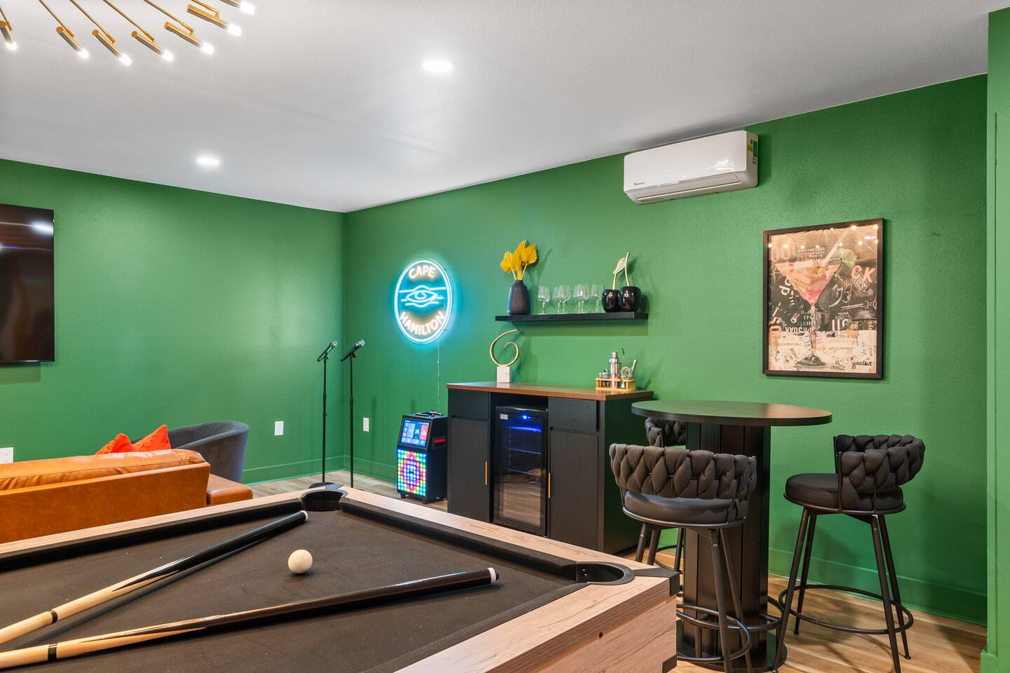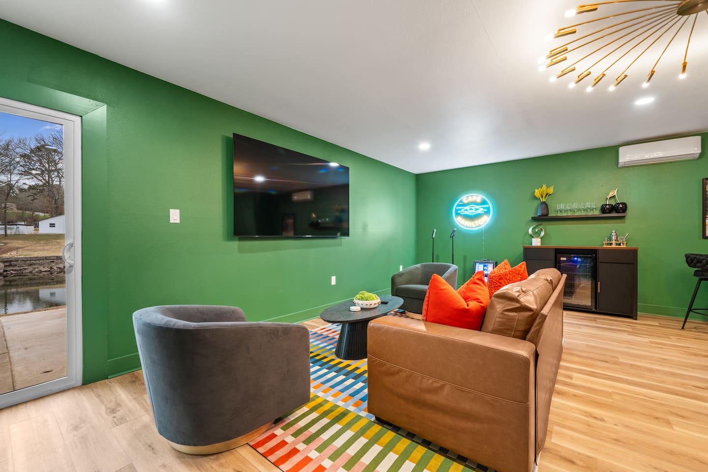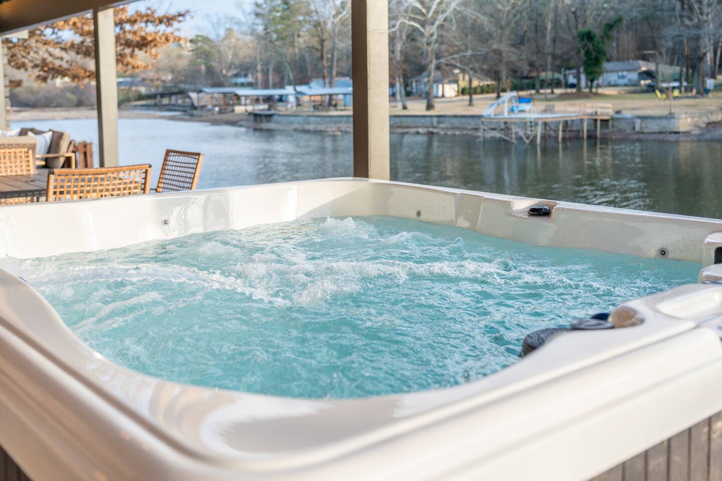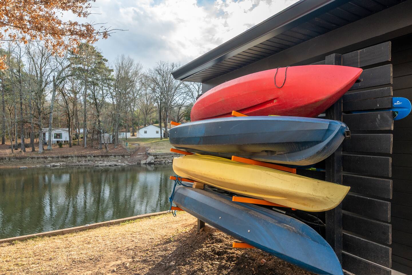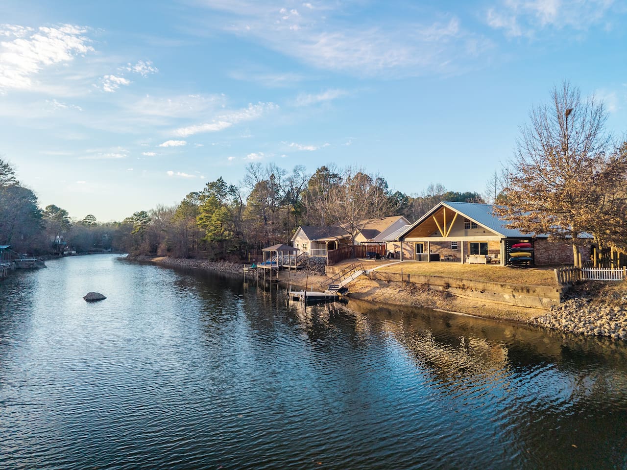 The home comfortably sleeps up to 10 guests and is built for group stays. The main level features three king bedrooms, while the upstairs enclosed loft offers two queen beds. Every bedroom includes a large smart TV, and the primary suite features a dedicated workspace. The private game room anchors the indoor experience with karaoke, pool and shuffleboard tables, and arcade games—perfect for all ages and weather-proof fun. The fully equipped kitchen and open living areas make gathering effortless. Outdoor Living Step outside to direct lake access with a private dock, water ladder, seating, and space to tie up a small boat. Enjoy four complimentary kayaks, relax in the private hot tub, or gather around the lakeside fire pit. A 45-foot covered patio offers space for outdoor dining, lounging, and evening cocktails, plus a small side yard for extra play space. During summer, water surrounds the property front and back—creating enhanced privacy and constant access that’s uncommon on Lake Hamilton. ☞☞HIGHLIGHTS & AMENITIES ☞☞ ✷ Peninsula lakefront home with private dock (sleeps 10) ✷ Water on both sides during summer months ✷ Prime lakefront location with excellent water access ✷ Game room: karaoke, pool table, arcade games & shuffleboard ✷ Private hot tub & lakeside fire pit ✷ Four kayaks included ✷ Large TVs throughout, including living room, game room & patio ✷ High-speed AT&T Fiber Wi-Fi ✷ Fully equipped kitchen & dedicated coffee bar ✷ Ideal for families and relaxed group getaways Whether you’re here to relax, play, or do a little of both, Cape Hamilton delivers the ultimate Hot Springs lakefront experience. Book now and start counting down to lake days, game nights, and unforgettable memories. 🌊🔥🎤