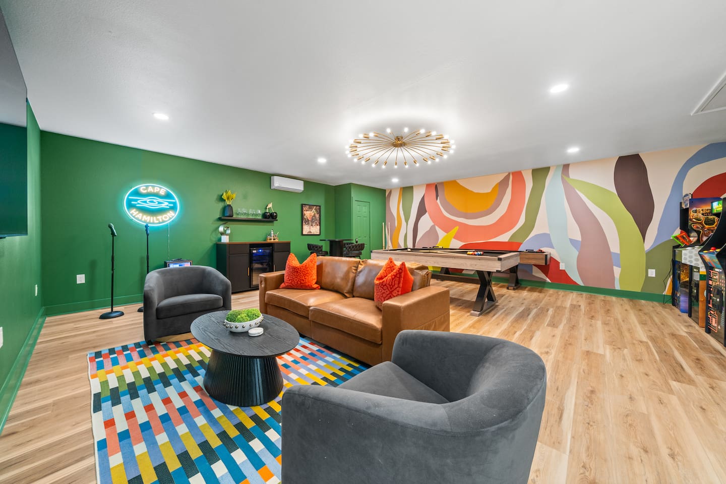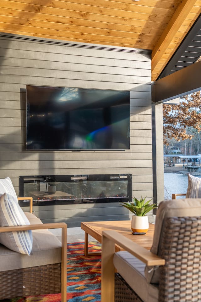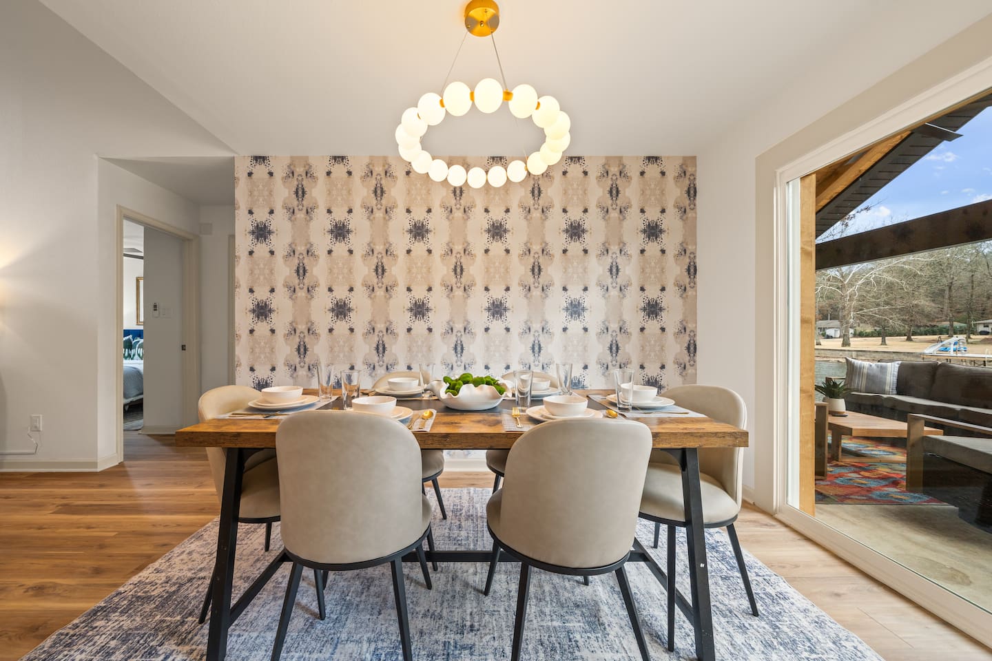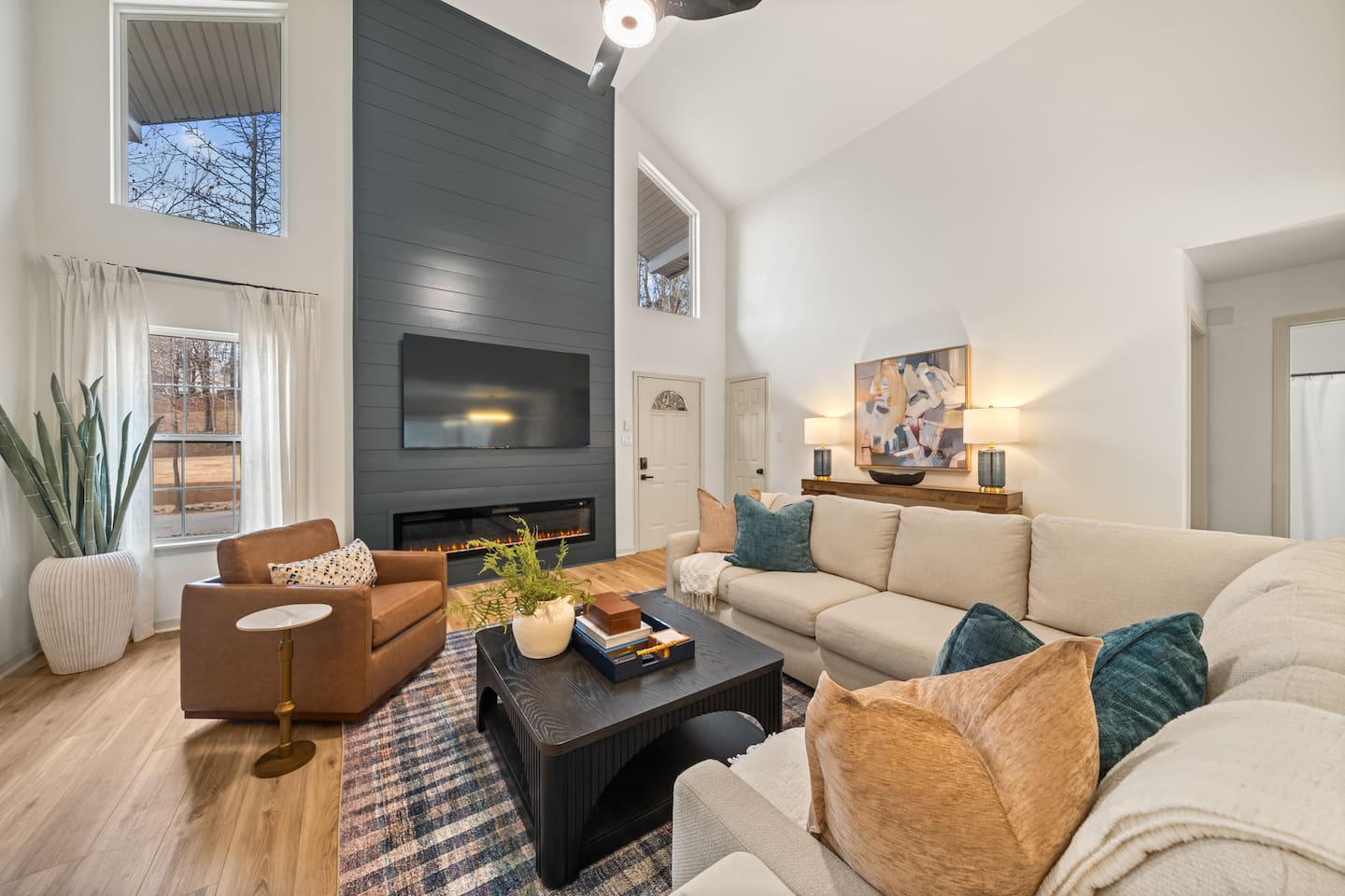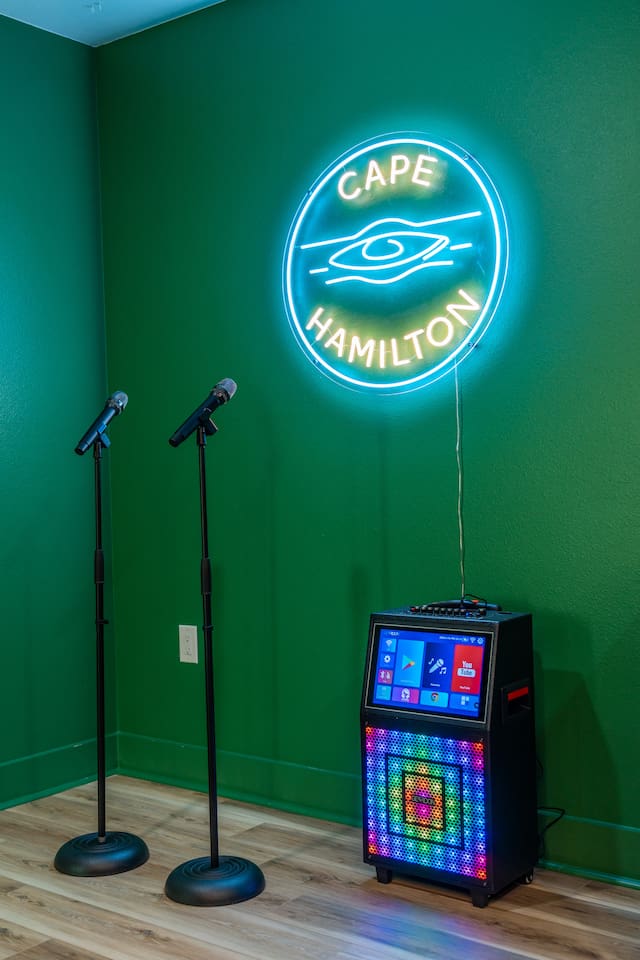 The home comfortably sleeps up to 10 guests and is built for group stays. The main level features three king bedrooms, while the upstairs enclosed loft offers two queen beds. Every bedroom includes a large smart TV, and the primary suite features a dedicated workspace. The private game room anchors the indoor experience with karaoke, pool and shuffleboard tables, and arcade games—perfect for all ages and weather-proof fun. The fully equipped kitchen and open living areas make gathering effortless. Outdoor Living Step outside to direct lake access with a private dock, water ladder, seating, and space to tie up a small boat. Enjoy four complimentary kayaks, relax in the private hot tub, or gather around the lakeside fire pit. A 45-foot covered patio offers space for outdoor dining, lounging, and evening cocktails, plus a small side yard for extra play space. During summer, water surrounds the property front and back—creating enhanced privacy and constant access that’s uncommon on Lake Hamilton. ☞☞HIGHLIGHTS & AMENITIES ☞☞ ✷ Peninsula lakefront home with private dock (sleeps 10) ✷ Water on both sides during summer months ✷ Prime lakefront location with excellent water access ✷ Game room: karaoke, pool table, arcade games & shuffleboard ✷ Private hot tub & lakeside fire pit ✷ Four kayaks included ✷ Large TVs throughout, including living room, game room & patio ✷ High-speed AT&T Fiber Wi-Fi ✷ Fully equipped kitchen & dedicated coffee bar ✷ Ideal for families and relaxed group getaways Whether you’re here to relax, play, or do a little of both, Cape Hamilton delivers the ultimate Hot Springs lakefront experience. Book now and start counting down to lake days, game nights, and unforgettable memories. 🌊🔥🎤