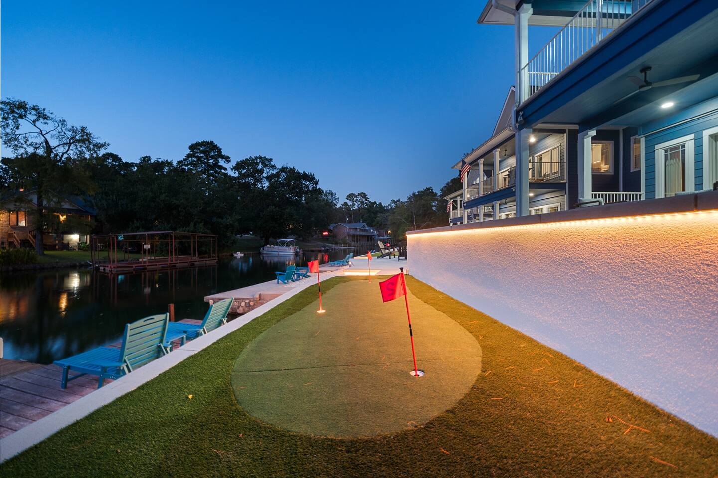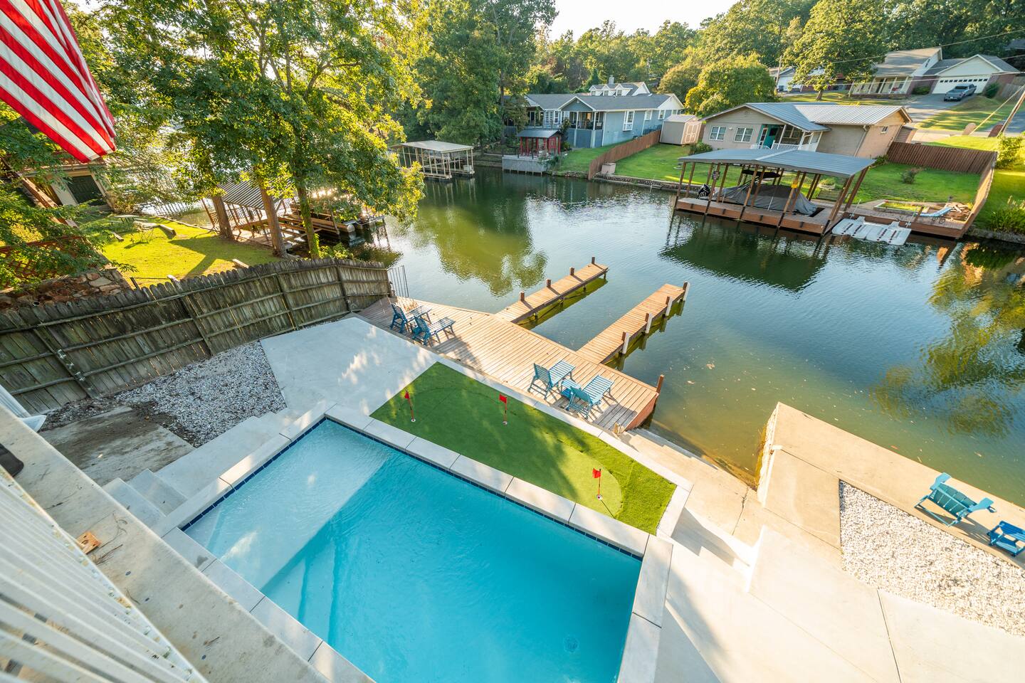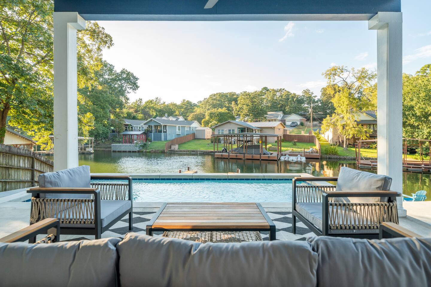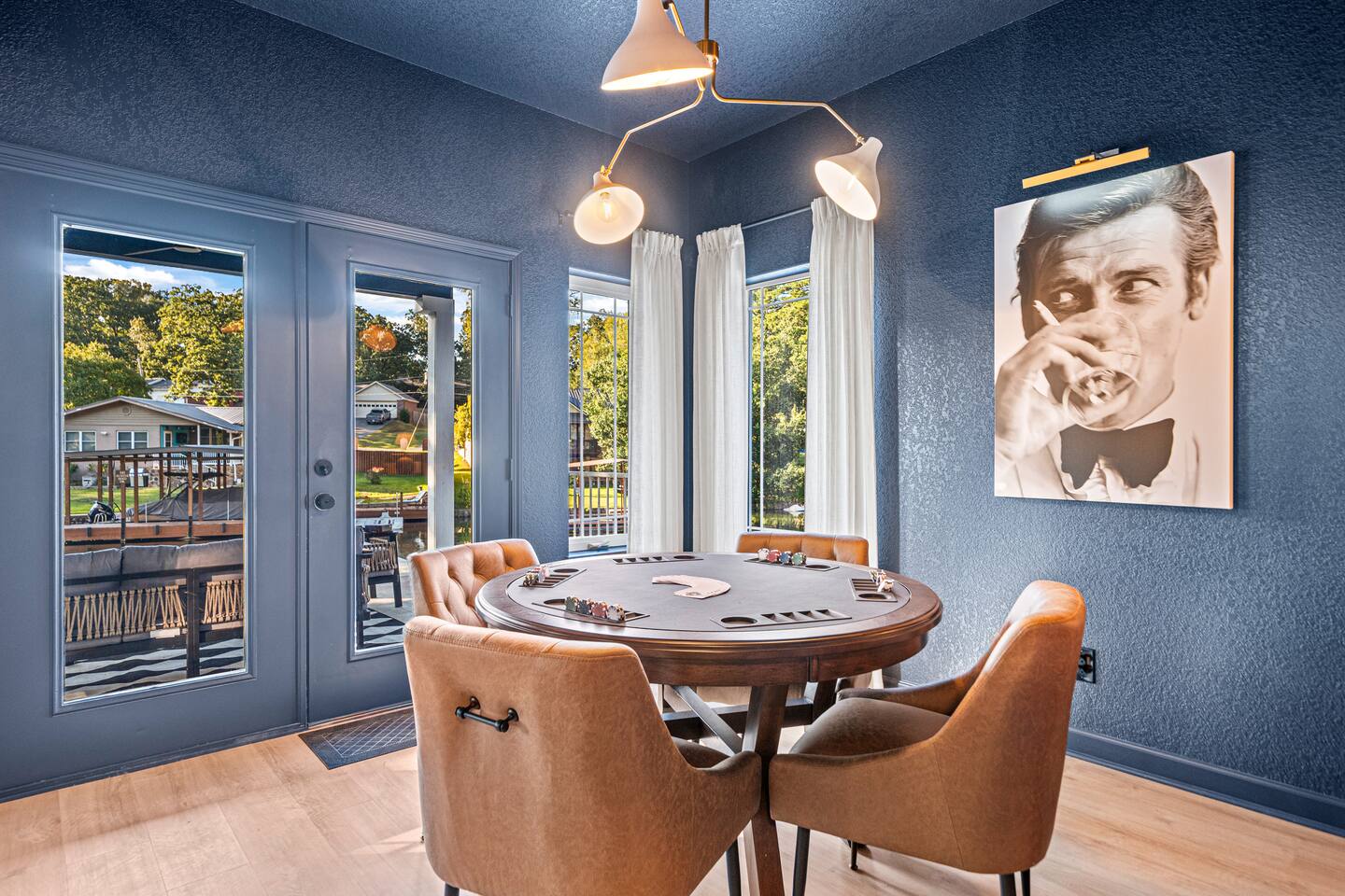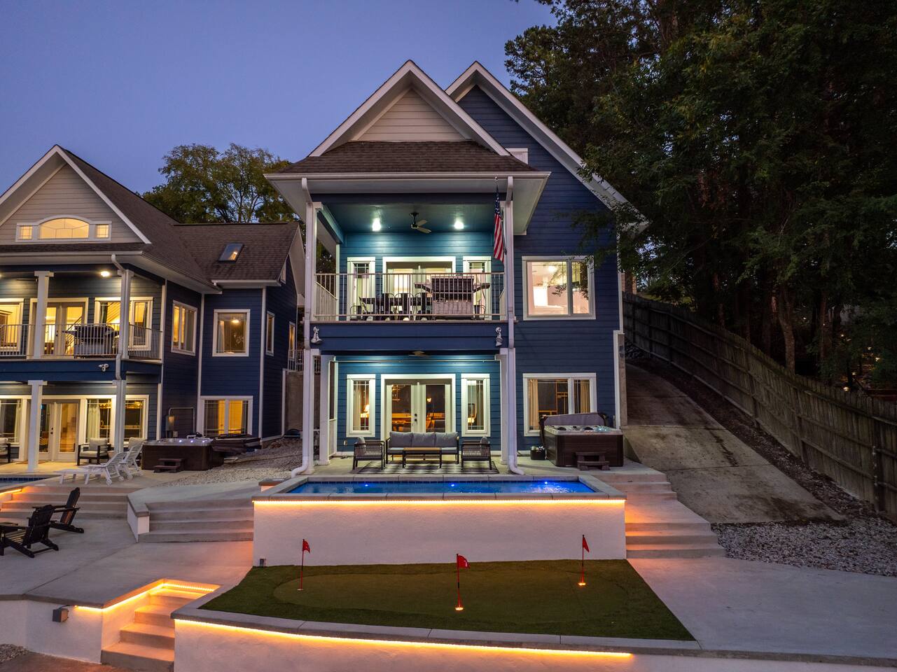 Outside, you’ll find everything you need for fun and relaxation — a boat dock for lake adventures, a plunge pool for cooling off, a hot tub for unwinding, and a putting green for a little friendly competition. Sunset cocktails by the water? Yes, please. Step inside and you’ll immediately see why this home is something special. Thoughtfully styled by a professional interior designer, every corner feels elevated yet comfortable — perfect for making memories with family or friends. The game room brings the fun indoors, with a pool table, arcade game, poker table, and wet bar that practically begs for late-night laughs. When it’s time to wind down, the custom-built bunk room steals the show. These aren’t your average bunks — they’re sleek, stylish, and built for both comfort and cool-factor. Whether you’re boating all day, hosting a poolside cookout, or cozying up for a game night, The Double Take is designed to make every moment count. What You’ll Love: ☆☆ Prime lakefront location with private dock ☆☆ Plunge pool, hot tub, and putting green with ambient lighting ☆☆ Designer interiors curated for comfort and style ☆☆ Epic game room with pool table, arcade, poker table & wet bar ☆☆ Custom-built bunk beds that guests of all ages will love ☆☆ One of three nearly identical neighboring homes — perfect for big groups or family reunions Come for the lake. Stay for the laughs. Leave with memories that make you do a double take.