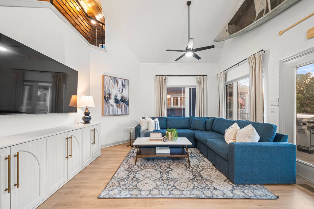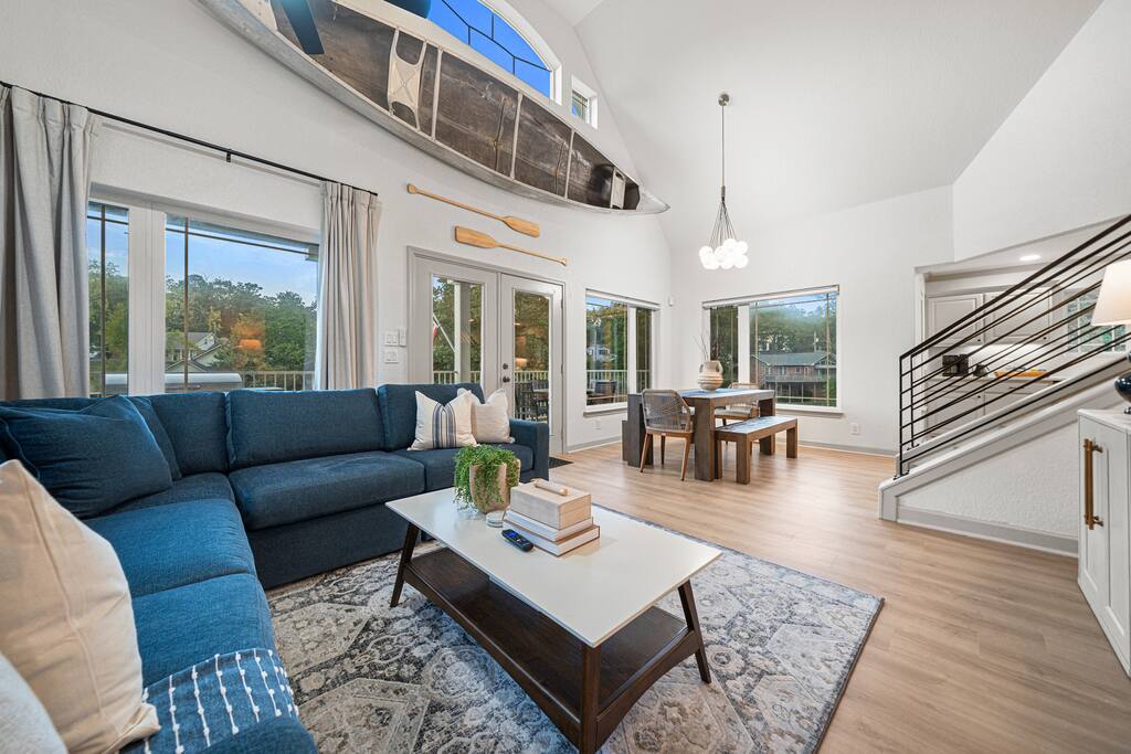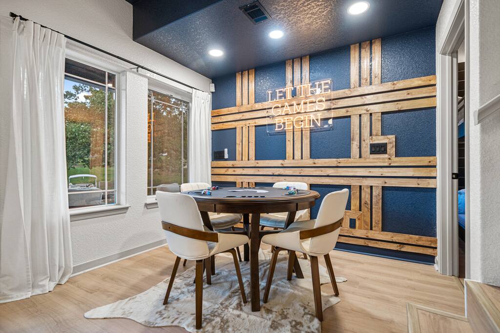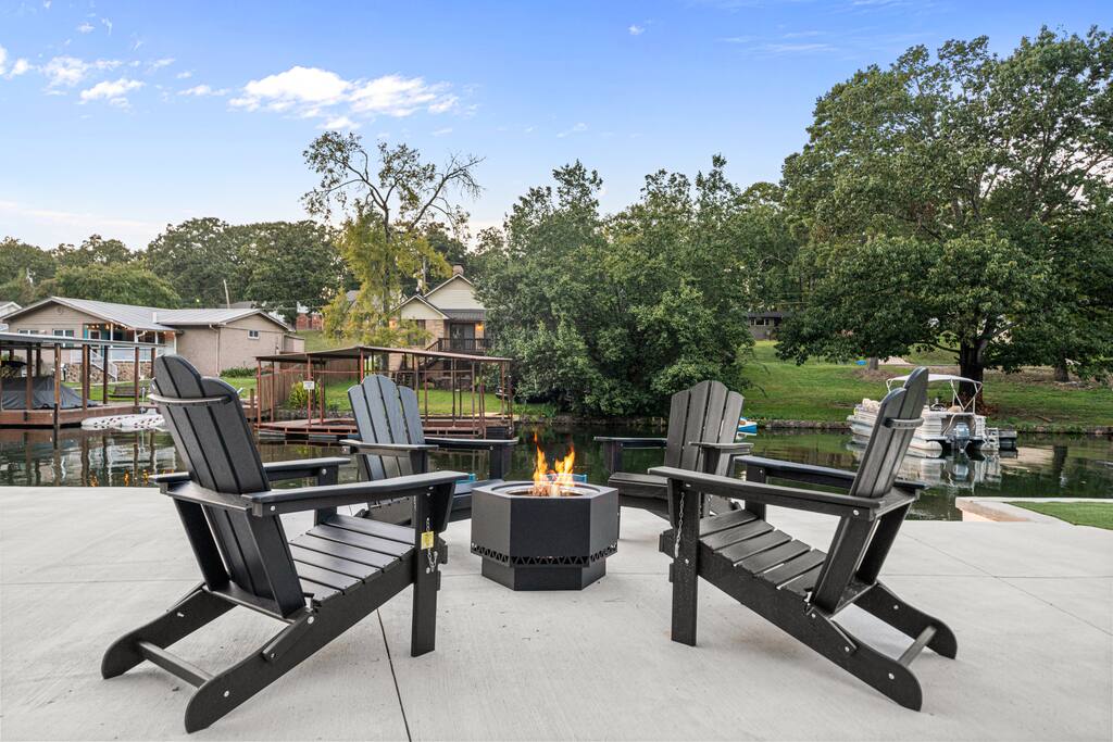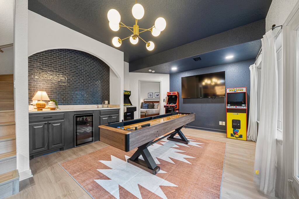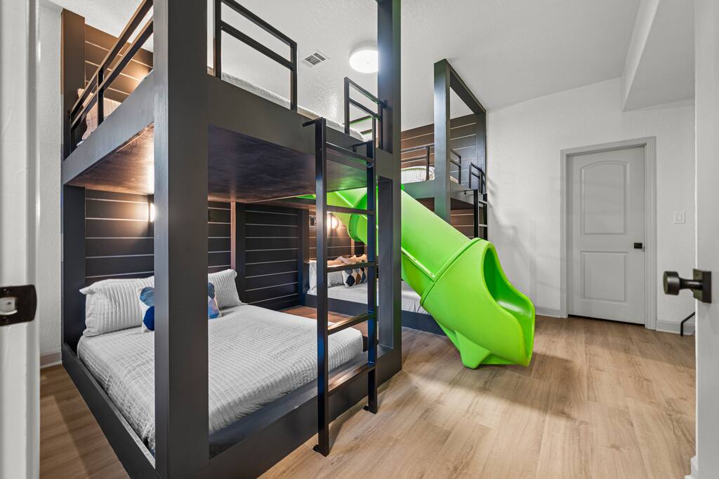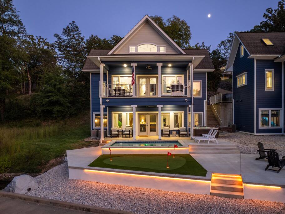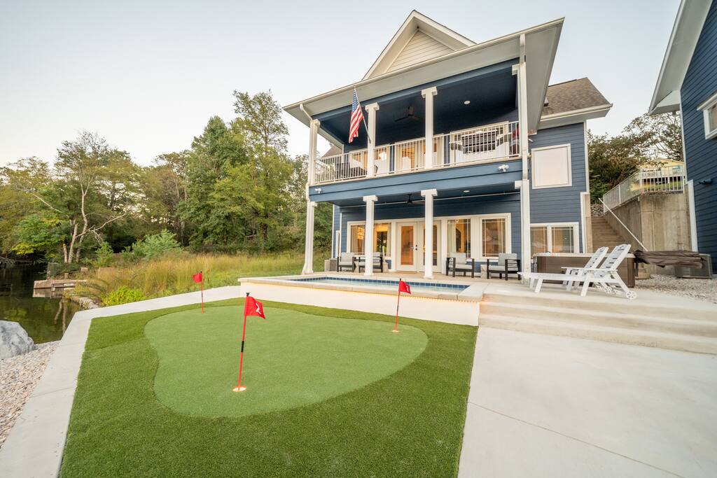 Step outside and let the lake set the scene. Spend your mornings on the lake, afternoons lounging in the heated plunge pool, and evenings relaxing in the hot tub or perfecting your short game on the putting green. When night falls, gather around the fire pit for stories, s’mores, and starlit laughter. Inside, the magic continues. Every room has been curated by a professional interior designer, creating a space that feels elegant yet effortless. The game room is a dream hangout, featuring a shuffleboard table, arcade game, poker table, and wet bar — ideal for friendly competition or winding down after a day on the water. And the kids (or kids-at-heart) will flip for the custom-built bunk room — complete with a tube slide between the bunks! It’s equal parts chic and whimsical, designed for both comfort and smiles. Whether you’re celebrating, reconnecting, or simply escaping the everyday, The Double Take delivers an unforgettable lakeside experience — refined, relaxed, and a little bit playful. Highlights You’ll Love: ☆☆ Lakefront setting with private boardwalk ☆☆ Heated plunge pool, hot tub, and putting green ☆☆ Fire pit for cozy lakeside evenings ☆☆ Designer-decorated interiors with curated finishes ☆☆ Game room with shuffleboard, poker table, arcade, and wet bar ☆☆ Custom-built bunk room with an exciting tube slide ☆☆ One of three matching neighboring properties, ideal for larger groups Discover a retreat that’s as refined as it is playful — welcome to The Double Take.