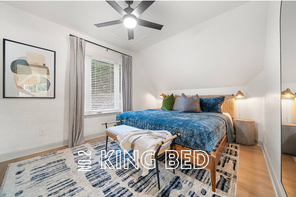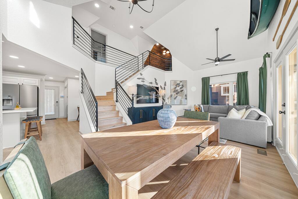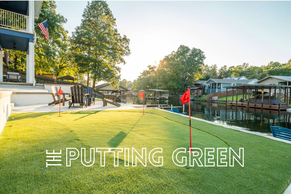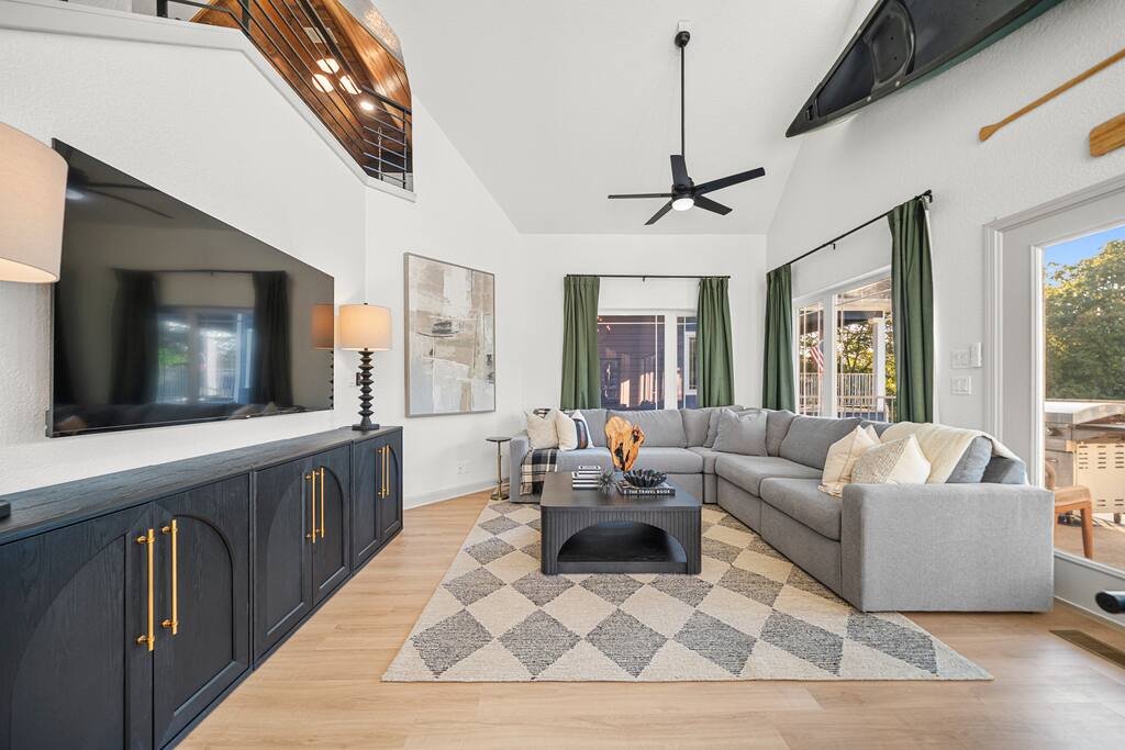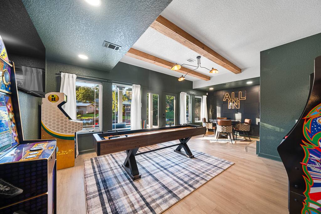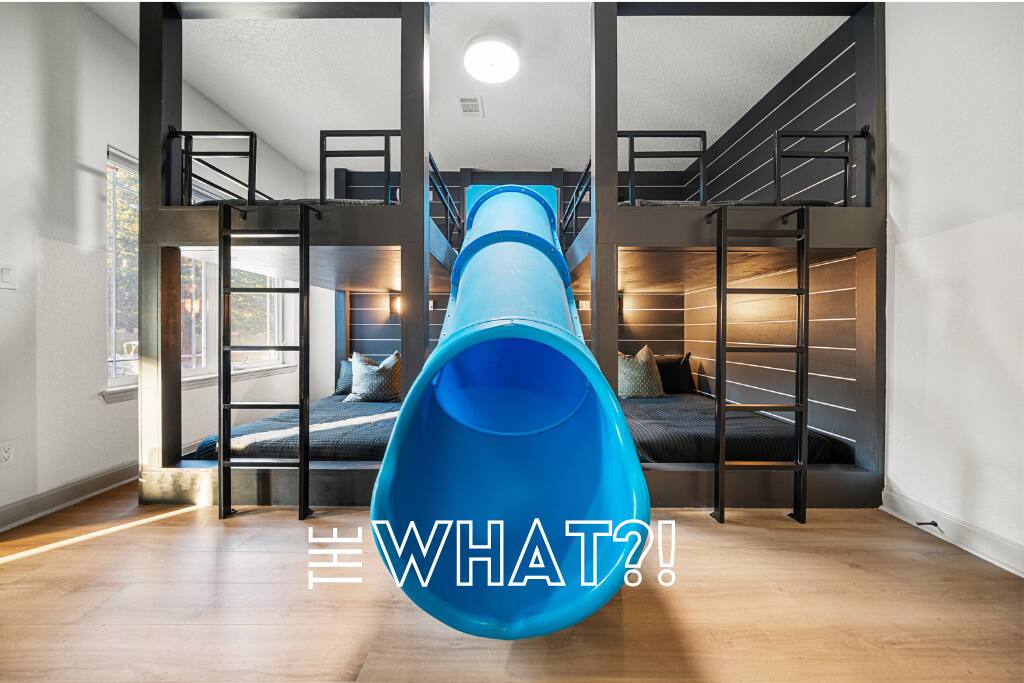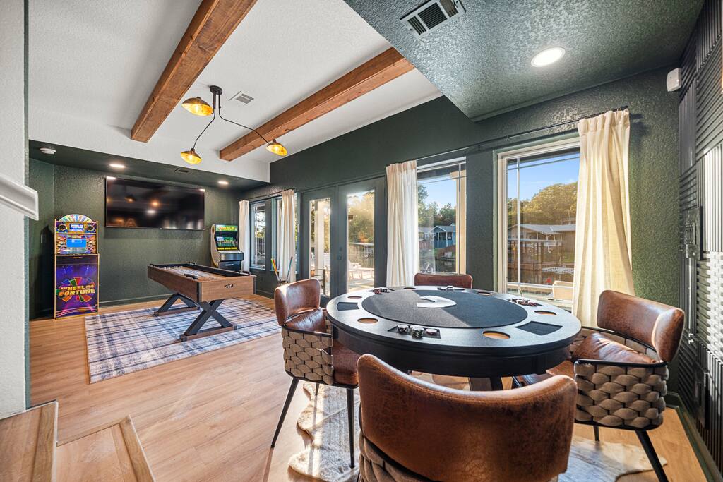 Outdoors, you’ll find a perfect mix of leisure and recreation. Spend your days on the lake, cool off in the plunge pool, or unwind in the hot tub as the sun sets over the lake. Challenge friends on the putting green, then gather around the fire pit for an evening of conversation and starlight. Inside, every detail reflects the touch of a professional interior designer. The interiors are warm and refined — balancing bold color palettes with natural textures and carefully selected furnishings. The game room serves as the home’s social hub, complete with a shuffleboard table, arcade games, poker table, and wet bar, perfect for both lively gatherings and relaxed nights in. The custom-built bunk room adds a playful yet stylish twist — featuring built-in beds connected by a tube slide that delights guests of all ages. It’s a space that perfectly blends design and fun, making it a favorite spot for kids and adults alike. Whether you’re hosting a family gathering, a friends’ getaway, or a corporate retreat, The Double Take offers an elevated lake experience that’s both elegant and effortlessly inviting. Property Highlights: ☆☆ Lakefront setting with private boardwalk ☆☆ Plunge pool, hot tub, and putting green ☆☆ Fire pit for cozy lakeside evenings ☆☆ Designer-decorated interiors with curated finishes ☆☆ Game room with shuffleboard, poker table, arcade, and wet bar ☆☆ Custom-built bunk room with an exciting tube slide ☆☆ One of three matching neighboring properties, ideal for larger groups Discover a retreat that’s as refined as it is relaxing — welcome to The Double Take.